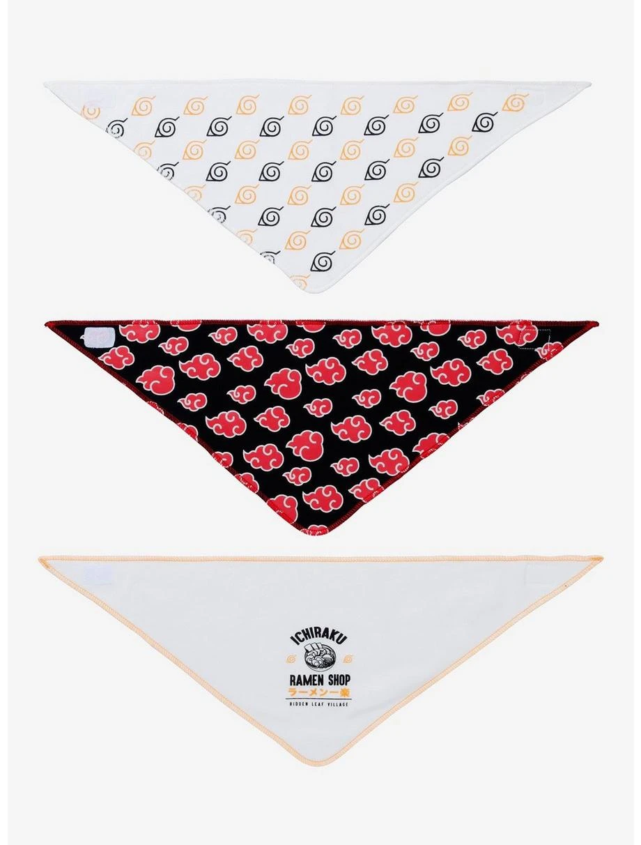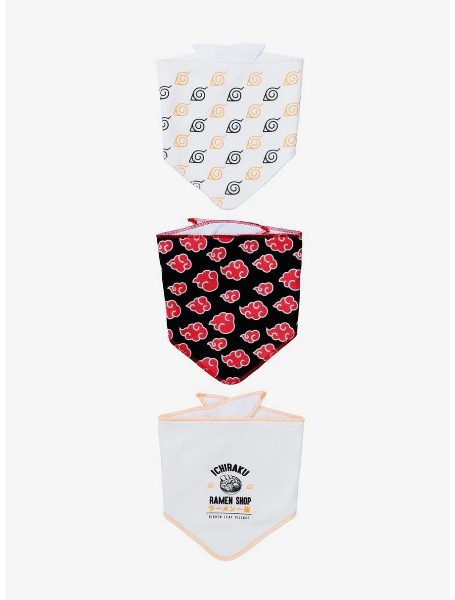 Make sure your little shinobi keeps their ramen in their bowl and not on their shirt with these Naruto Shippuden bandana bibs! This three-pack features one Akatsuki Cloud-printed bib, one with the Hidden Leaf Village symbol, and one with the Ichiraku Ramen logo.ย